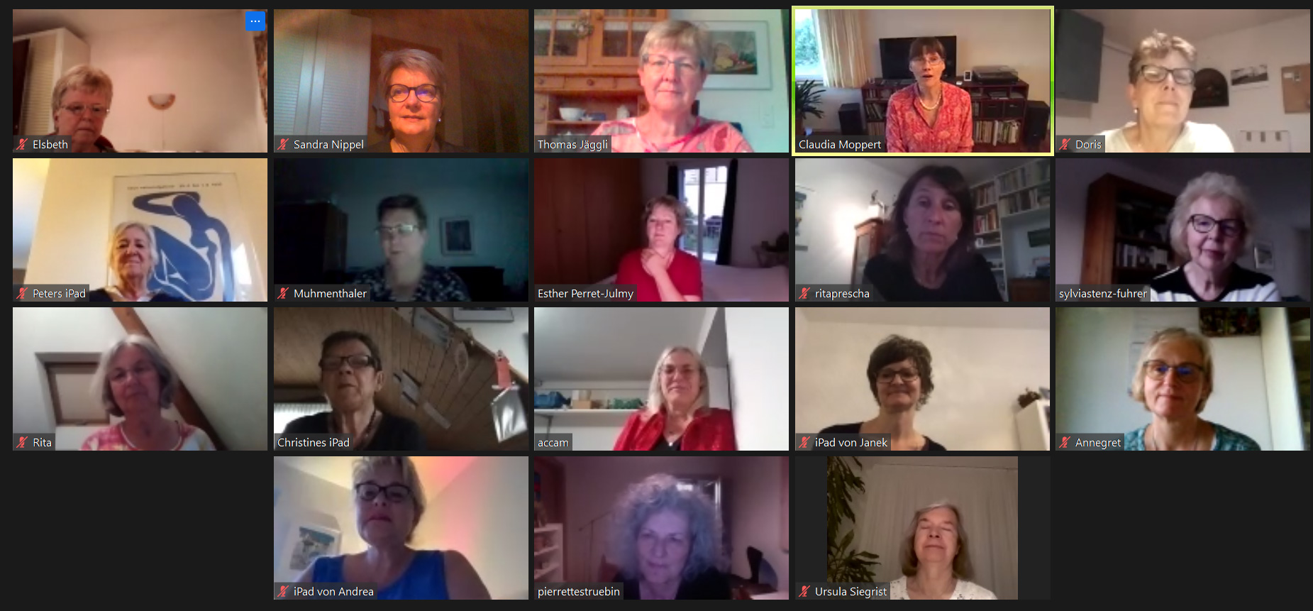 Die Leitung des Frauenchors Muttenz hat zu Beginn des Lockclowns entschieden, online mittels Videochat zu proben. Trotz erschwerten Bedingungen ist die Wiedersehensfreude jeden Mittwochabend gross. Das gemeinsame Singen wird von allen schmerzlich vermisst. Auch wenn das Online-Singen nicht denselben Effekt hat wie die physischen Treffen, sorgt es dennoch dafür, dass die Stimmbildung der Sängerinnen erhalten bleibt.